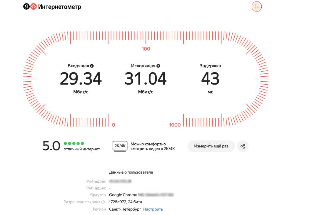 Яндекс Интернетометр — это онлайн-сервис для быстрой проверки параметров интернет-соединения. Он показывает, с какой скоростью данные приходят на устройство, с какой скоростью уходят обратно в сеть и насколько быстро соединение откликается.